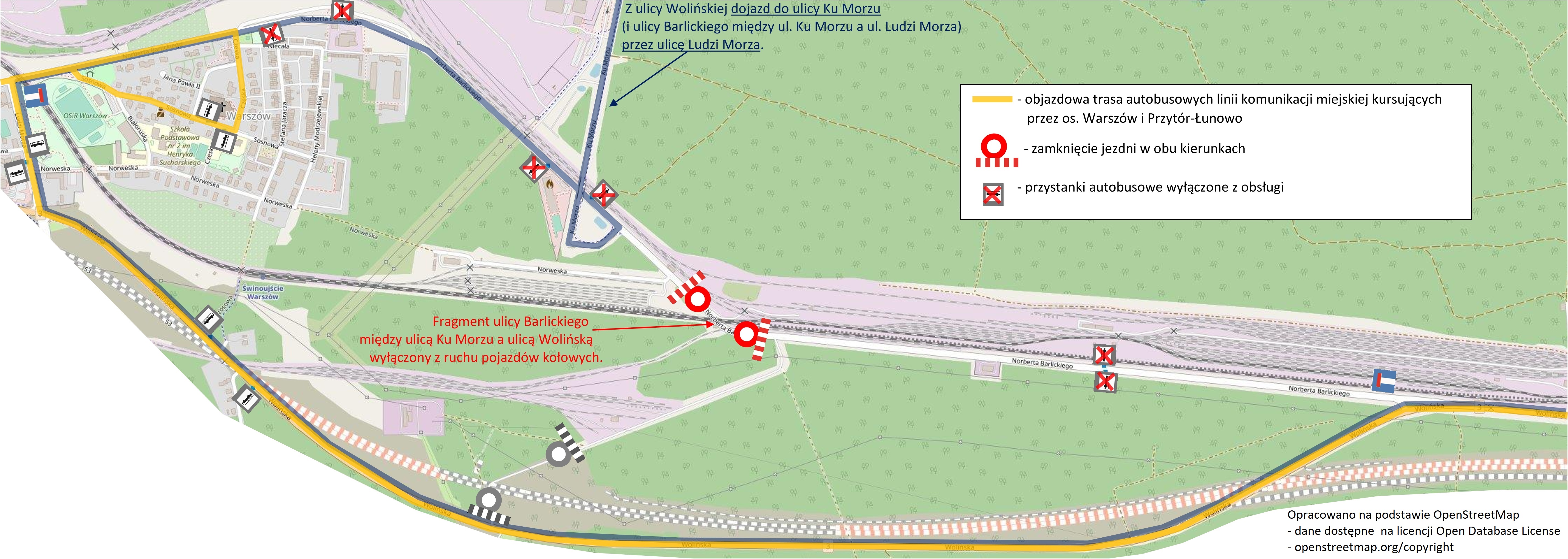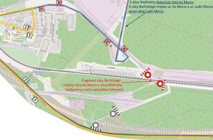Wykonawca, który na zlecenie PKP PLK S.A. realizuje zadanie w ramach projektu pn. „Poprawa dostępu kolejowego do portów morskich w Szczecinie i Świnoujściu”, przekazał informację, że od wtorku 6 września 2022 r. godz. 10.00 będzie tymczasowo zamknięta jezdnia w rejonie przejazdu kolejowego przez ulicę Barlickiego pomiędzy ulicą Ku Morzu a ulicą Wolińską w Świnoujściu. Zatem dojazd do odcinka ulicy Barlickiego pomiędzy ulicą Ludzi Morza a ulicą Ku Morzu i osiedla Warszów oraz do ulicy Ku Morzu możliwy będzie tylko od strony ulicy Ludzi Morza. Zakończenie prac i otwarcie przejazdu dla ruchu kołowego przewidywane jest na połowę października br.