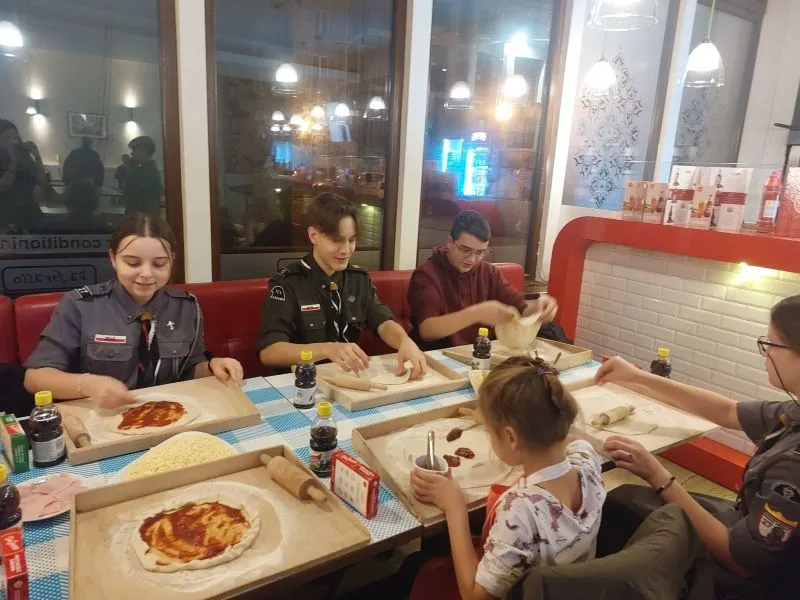 Spotkałyśmy z wędrownikami w piątek w jednej ze świnoujskich pizzerii ponieważ nasza zbiórka była wyprawą do Włoch gdzie dh. Jelińskiego przyjął późniejszy zbrodniarz Benito Mussolini - przeprowadziliśmy dyskusje na ten temat. Każdy zrobił swoją własną wyjątkową pizzę. Po zjedzeniu dyskutowaliśmy czyja pizza była najsmaczniejszą. Następnie ustalaliśmy punkty na trasę harcerska gdzie każdy z wędrowników przygotował danie z państwa z wyprawy były m.in. USA – Hamburger, Afryce - Egipska sałatka z grillowanego ananasa na ostro, w Azji - Indyjski płaski chleb – parathas, a w Meksyku Chimichanga wszystko okraszone historiami z książki skauta dookoła świata.