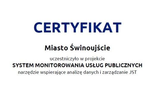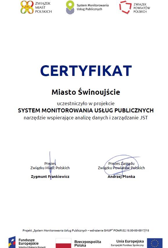 Miasto Świnoujście zakończyło uczestnictwo w projekcie zatytułowanym „System Monitorowania Usług Publicznych – wdrożenie SMUP” uzyskując stosowny certyfikat i będąc jednym z pierwszych samorządów potrafiących posługiwać się nowym narzędziem.