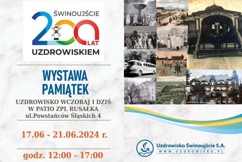 Z okazji jubileuszu 200-lecia uzdrowiska w Świnoujściu, w imieniu organizatora zapraszamy na wystawę pamiątek firmowych „Uzdrowiska Świnoujście S.A.”. Będzie można obejrzeć stare zdjęcia historycznych obiektów, dawnych zabiegów rehabilitacyjnych, przejrzeć kroniki firmowe stare foldery i ulotki reklamowe. Wystawa będzie dostępna od poniedziałku do piątku (17.06 – 21.06.2024 r.) w godzinach od 12.00 do 17.00 w Zakładzie Przyrodniczym Rusałka przy ul. Powstańców Śląskich.
