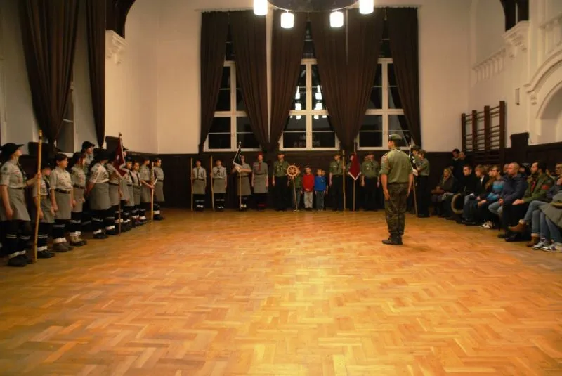 O 17 rozpoczął się apel. Drużyny wmaszerowały do auli szkoły, sztandary zostały wprowadzone. Meldunek, rozkaz, odznaczenia.