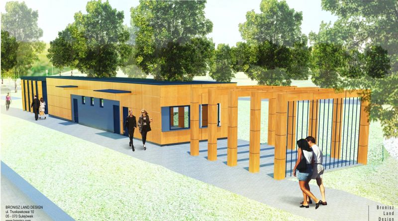 W budynku znajdować się będzie sala wielofunkcyjna z przyległymi sanitariatami (damski, męski i dla niepełnosprawnych) oraz pomieszczenia obsługi parku. Elewacja wykonana zostanie z paneli drewnopodobnych HPL w naturalnego drewna bejcowanego, miejscami uzupełniona tynkiem elewacyjnym. Całości towarzyszyć będzie pergola z zielenią. Sam budynek będzie parterowy, niepodpiwniczony o wymiarach 5,82x21,72 metra oraz wysokości całkowitej 3,7 metra. Wzdłuż ściany budynku przewiduje się lokalizację tymczasowej sceny lub przenośnego ekranu (na elewacji) do pokazów multimedialnych.