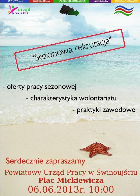 Poszukujesz pracowników na okres sezonu letniego? A może do pracy całorocznej? Chcesz zorganizować staż zawodowy, wolontariat, bądź praktyki w swojej firmie? Weź udział w „Sezonowej rekrutacji”! Już 6 czerwca 2013r. w godz. od 10:00 do 12:00 na Placu Mickiewicza w Świnoujściu odbędzie się „Sezonowa rekrutacja”, podczas której pracodawcy będą mieli niepowtarzalną okazję do zebrania dokumentów aplikacyjnych oraz przeprowadzenia wstępnych rozmów z kandydatami do pracy.