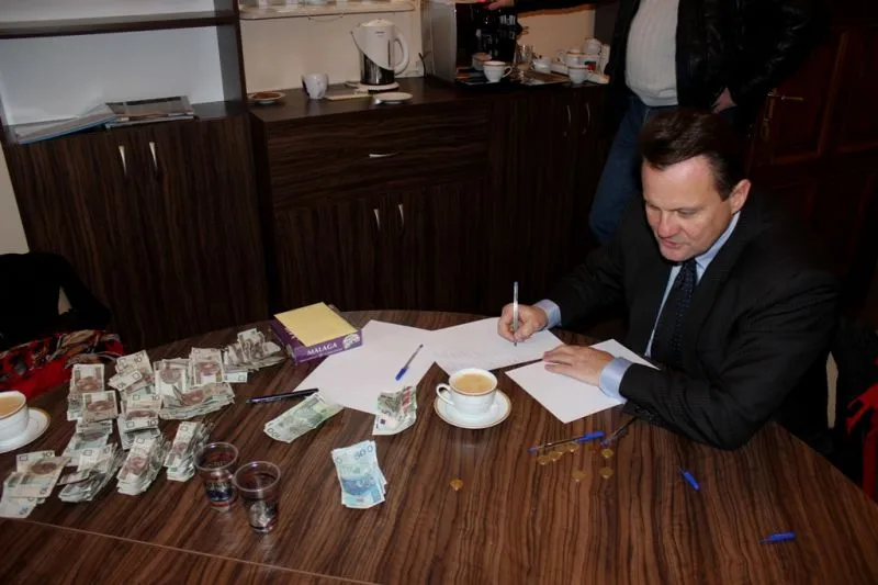Dzisiaj o godz. 11.30 w biurze Przewodniczącego Rady Miasta skarbona została komisyjnie otworzona a jej zawartość przeliczona. Okazało się, że zebraliśmy kwotę 4398,07 złotych oraz 126,92 euro. Po spieniężeniu kwoty euro uzyskaliśmy 526 złotych.