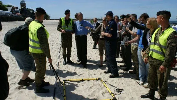 Podczas wizyty Bogdan KLICH obserwował działania saperów przy oczyszczaniu odcinka plaży oraz obejrzał sprzęt i wyposażenie, którym dysponuje patrol rozminowania