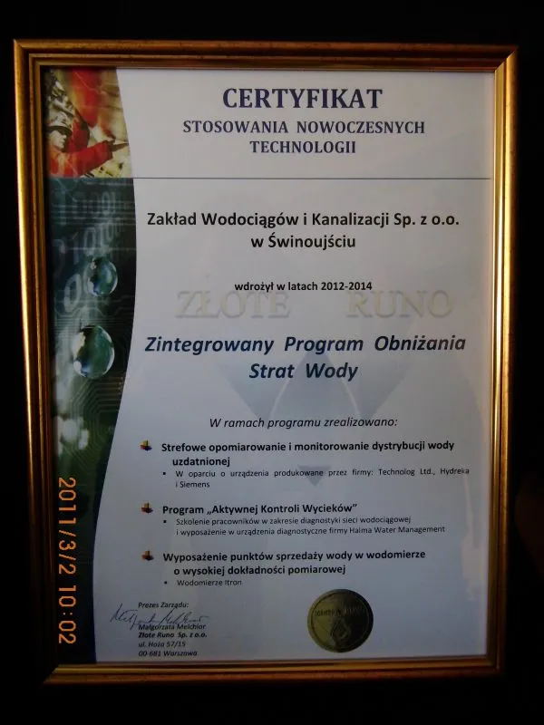 Miłym akcentem były wystąpienia Pani Prezydent Michalskiej, przedstawiciela Izby Gospodarczej Wodociągi Polskie – Z-cy Przewodniczącego Rady Izby Pana Ryszarda Sobieralskiego oraz przedstawiciela Zachodniopomorskiego Forum Wodociągowego Pana Ryszarda Wójcika. Okoliczność była również okazją do wręczenia naszym wodociągom certyfikatu stosowania nowoczesnych technologii w zakresie wdrażania zintegrowanego programu obniżania strat wody.