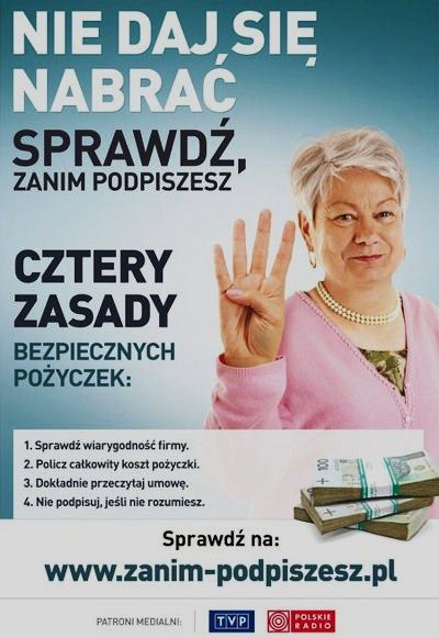 Chociaż maksymalne nominalne oprocentowanie pożyczek wynosi obecnie 12 procent, to wiele firm pożyczkowych oferuje produkty, których rzeczywista roczna stopa oprocentowania może przekraczać tysiące procent. Dlatego też nierozważne podpisanie umowy o „szybką i łatwą pożyczkę” może prowadzić do utraty dorobku całego życia i rodzinnych dramatów. Stąd kolejna odsłona akcji społecznej „Nie daj się nabrać. Sprawdź, zanim podpiszesz!”.