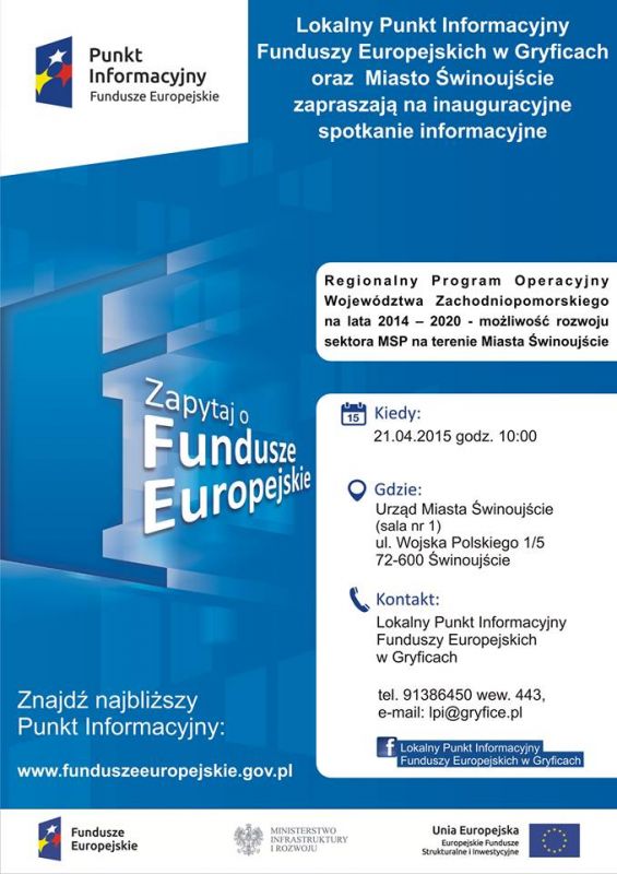 Lokalny Punkt Informacyjny Funduszy Europejskich w Gryficach oraz Miasto Świnoujście zapraszają na inauguracyjne spotkanie informacyjne - Regionalny Program Operacyjny Województwa Zachodniopomorskiego na lata 2014 – 2020 - możliwość rozwoju sektora MSP na terenie Miasta Świnoujście. W ramach spotkania przedstawione zostaną wszystkim zainteresowanym możliwości uzyskania wsparcia na rozwój działalności gospodarczej ze środków RPO WZ 2014 - 2020.