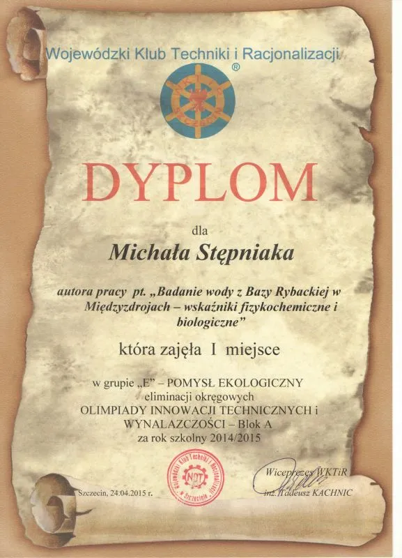W dniu 6 maja 2015 jury etapu okręgowego   poinformowało szkołę, że wyżej wymienieni uczniowie zostali laureatami eliminacji okręgowych. W związku z tym, że uczniowie zajęli  I miejsca w obu kategoriach będą reprezentować okręg zachodniopomorski w finale ogólnopolskim Olimpiady Innowacji Technicznych i Wynalazczości. Trzymamy za nich kciuki!