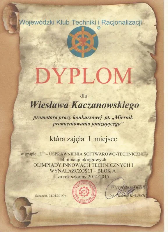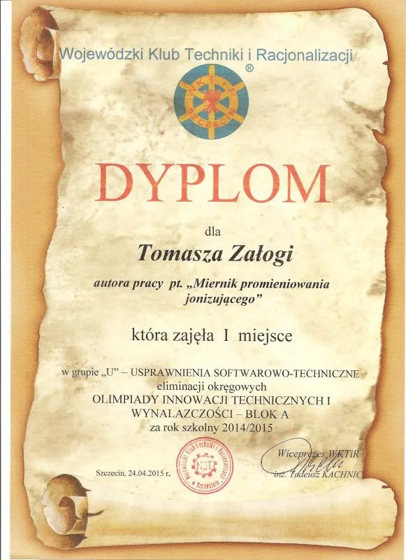 W trakcie kończącego się roku szkolnego cała czwórka brała udział w eliminacjach. W kategorii uczniowie klasy IV technik informatyk  Michał Czorniej i Tomasza Załoga przygotowali pracę pt. "Miernik promieniowania jonizującego". Opiekunem uczniów był Pan Wiesław Kaczanowski. Innowacyjność przygotowanego projektu polega na wydzieleniu z tradycyjnego licznika dwóch osobnych, aczkolwiek niezbędnych do wspólnego działania częci: pomiarowej i przetwarzającej dane. Część pomiarowa zbiera wszystkie dane ze środowiska zewnętrznego tzn. ilość cząstek promieniowania, następnie za pomocą interfejsu Bluetooth licznik wysyła informacje do urządzenia wyposazonego w system Android np. telefon, tablet , laptop. Poprzez stworzone przez uczniów autorskie oprogramowanie system ten przetwarza dane i przedstawia w odpowiedniej formie. Część przetwarzająca dane, czyli aplikacja mobilna, pozwala również na sterowanie licznikiem.