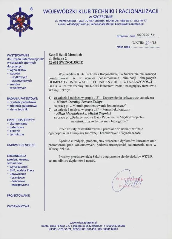 Michał Czorniej, Tomasz Załoga, Alicja Marchelewska i Michał Stępniak jako najlepsi w okręgu zachodniopomorskim wezmą udział w Ogólnopolskim Finale Olimpiady Innowacji Technicznych i Wynalazczości. Dwaj pierwsi w kategorii „Usprawnienia softwarowo-techniczne”, druga dwójka w kategorii „Pomysł ekologiczny”.