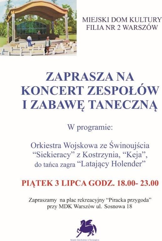 Orkiestra Wojskowa ze Świnoujścia, zespoły Latający Holender, Keja i Siekieracy - zagrają dziś (piątek) i jutro (sobota) w strefie rekreacyjnej Piracka przygoda przy Miejskim Domu Kultury przy ulicy Sosnowej. Będzie można nie tylko posłuchać, ale również potańczyć. Zapraszamy dziś i jutro od godziny 18.00. Impreza jest dofinansowana przez firmę Gaz-System. Zobacz szczegóły.