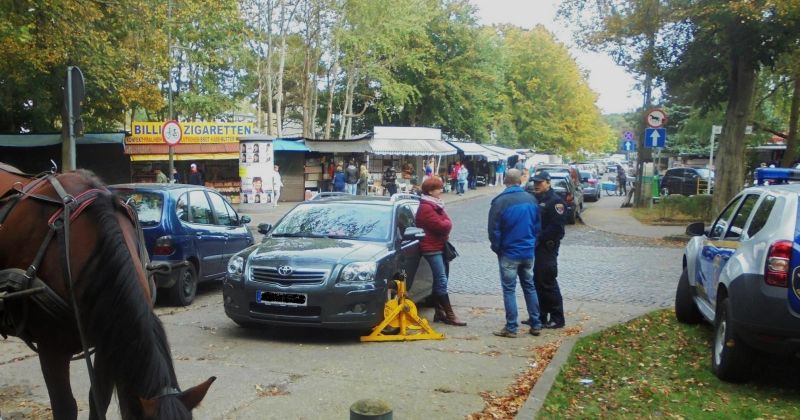 Takim mandatem został dziś ukarany niemiecki kierowca, który zaparkował samochód na wyjeździe z postoju dorożek przy ulicy Wojska Polskiego. W związku z tym, że kierowcy nie było przy aucie, Straż Miejska założyła na koła blokadę. O zastawionym wyjeździe poinformowali strażników sami dorożkarze.