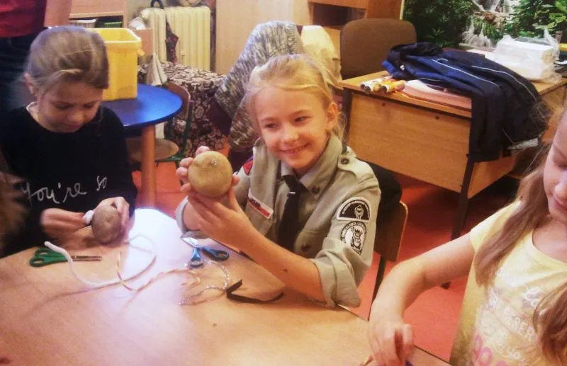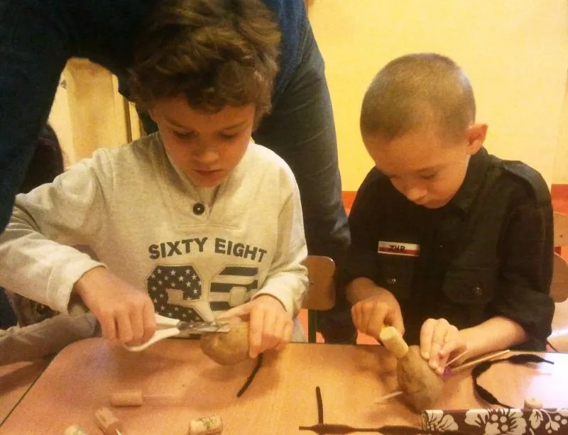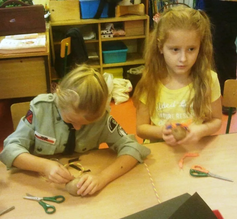 Po pląsie o ziemniaku, który bardzo lubił pić napój gazowany i jeść lody, przyszedł czas na stworzenie ziemniaków cudaków. Korzystając z materiałów zgromadzonych w przedszkolnej „skrzyni skarbów” ( koraliki, guziki, wykałaczki, włóczkę, tkaniny, tasiemki, koronki, sznurek, taśma samoprzylepna, sosnowe igły, jarzębinę, liście, bibułę, folię, plastelinę itd. ) przedszkolaki wraz z rodzicami tworzyli najróżniejsze figurki z ziemniaków. Gotowe prace zostały umieszczone razem na wystawce.