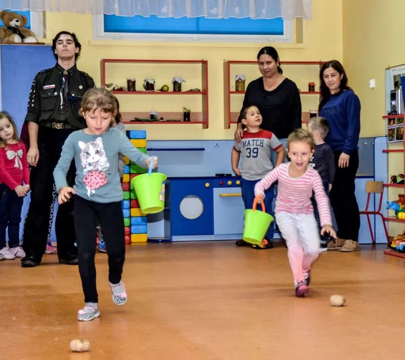 Przedszkolaki zostały uroczyście powitane przez Króla Ziemniaka, który wraz z harcerskim dworem zaprosił je do zabaw integracyjnych. Po pierwszej części zabaw, Król zadawał przedszkolakom zagadki związane z ziemniakami i innymi warzywami, po których obdarowywał dzieci z nagrodami. Pomocne okazywały się podpowiedzi samego Króla i jego harcerskich asystentów, gdyż święto pieczonego ziemniaka to też element edukacji.