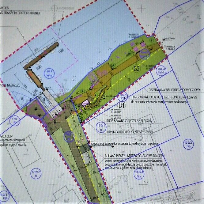 Na wschód od slipu zaplanowano likwidację istniejących ogrodzeń, usunięcie zdewastowanych elementów zagospodarowania terenu, uporządkowanie zieleni porastającej teren. Ponadto wykonany będzie bulwar na całej długości terenu.