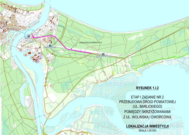 Projekt, obejmuje zadania inwestycyjne przebudowę drogi powiatowej (ul. Barlickiego) pomiędzy skrzyżowaniami z ul. Wolińską i Dworcową budowę nowego odcinka drogi łączącej ulicę Barlickiego z drogą krajową nr 3 (włącznie z przekroczeniem bezkolizyjnym linii kolejowych i dowiązaniem do realizowanego przez Polskie LNG wiaduktu nad ulicą Barlickiego w ciągu ulicy Ku Morzu) przebudowę drogi powiatowej (ul. Ludzi Morza) pomiędzy skrzyżowaniami z ul. Barlickiego i nowoprojektowaną drogą (tzw. obwodnicą Bazy Las) przebudowę odcinka drogi gminnej (ul. Ku Morzu) pomiędzy wjazdem na falochron wschodni i latarnią morską wraz z budową parkingu buforowego dla pojazdów oczekujących na wjazd do portu budowę odcinka drogi (tzw. obwodnicy Bazy Las) pomiędzy drogą krajową nr 3 i ul. Ludzi Morza.