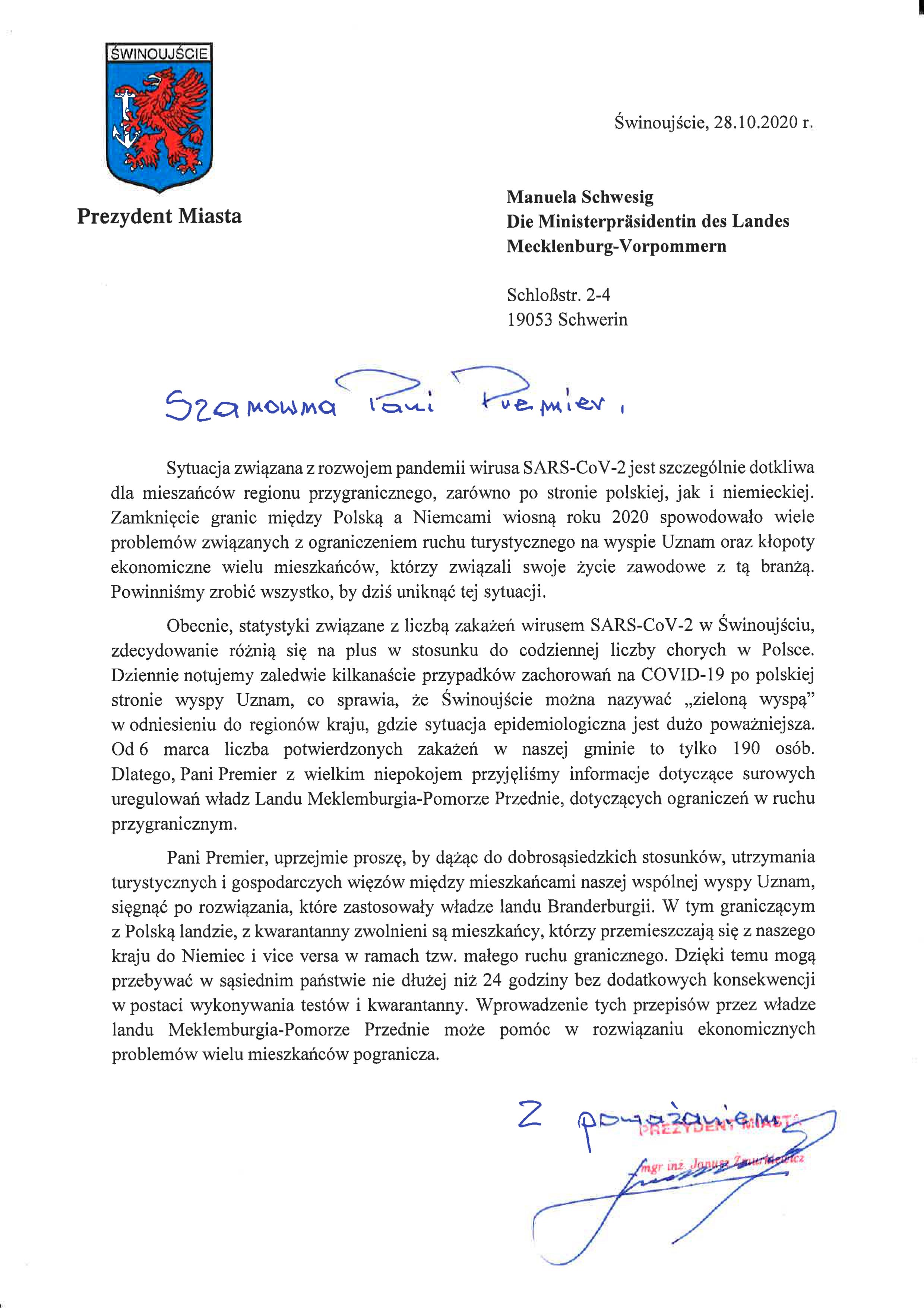 W związku z pandemicznymi obostrzeniami w Niemczech, które mają wpływ na życie mieszkańców Świnoujścia, prezydent Janusz Żmurkiewicz zaapelował do władz landu Meklemburgia Pomorze Przednie z prośbą o rozważenie złagodzenia niektórych rygorów.