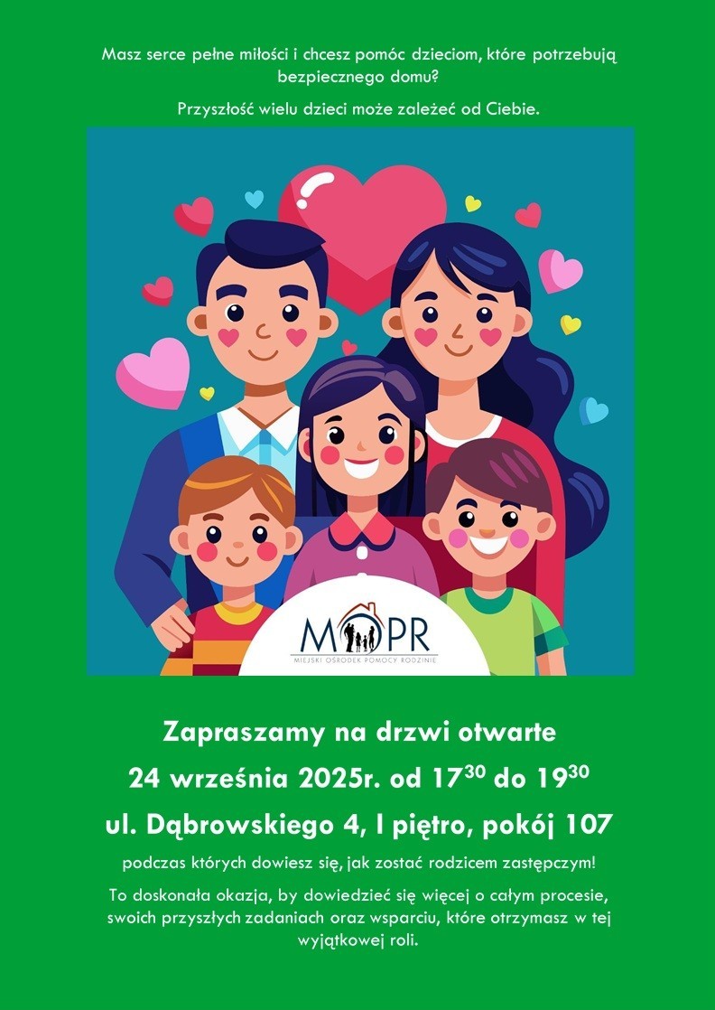 Jeśli kiedykolwiek myślałeś o tym, żeby pomóc dziecku w trudnej sytuacji, ale nie wiedziałeś, od czego zacząć – mamy dla Ciebie idealną okazję. Miejski Ośrodek Pomocy Rodzinie zaprasza na drzwi otwarte, które odbędą się dziś, tj. 24 września 2025 roku w godzinach 17:30–19:30, w siedzibie MOPR przy ul. Dąbrowskiego 4, I piętro, pokój 107. W przyjaznej atmosferze dowiesz się, jak wygląda proces stania się rodziną zastępczą, jakie warunki trzeba spełnić, na czym polega codzienność w tej roli i – co najważniejsze – jak wielką różnicę możesz zrobić w życiu drugiego człowieka.