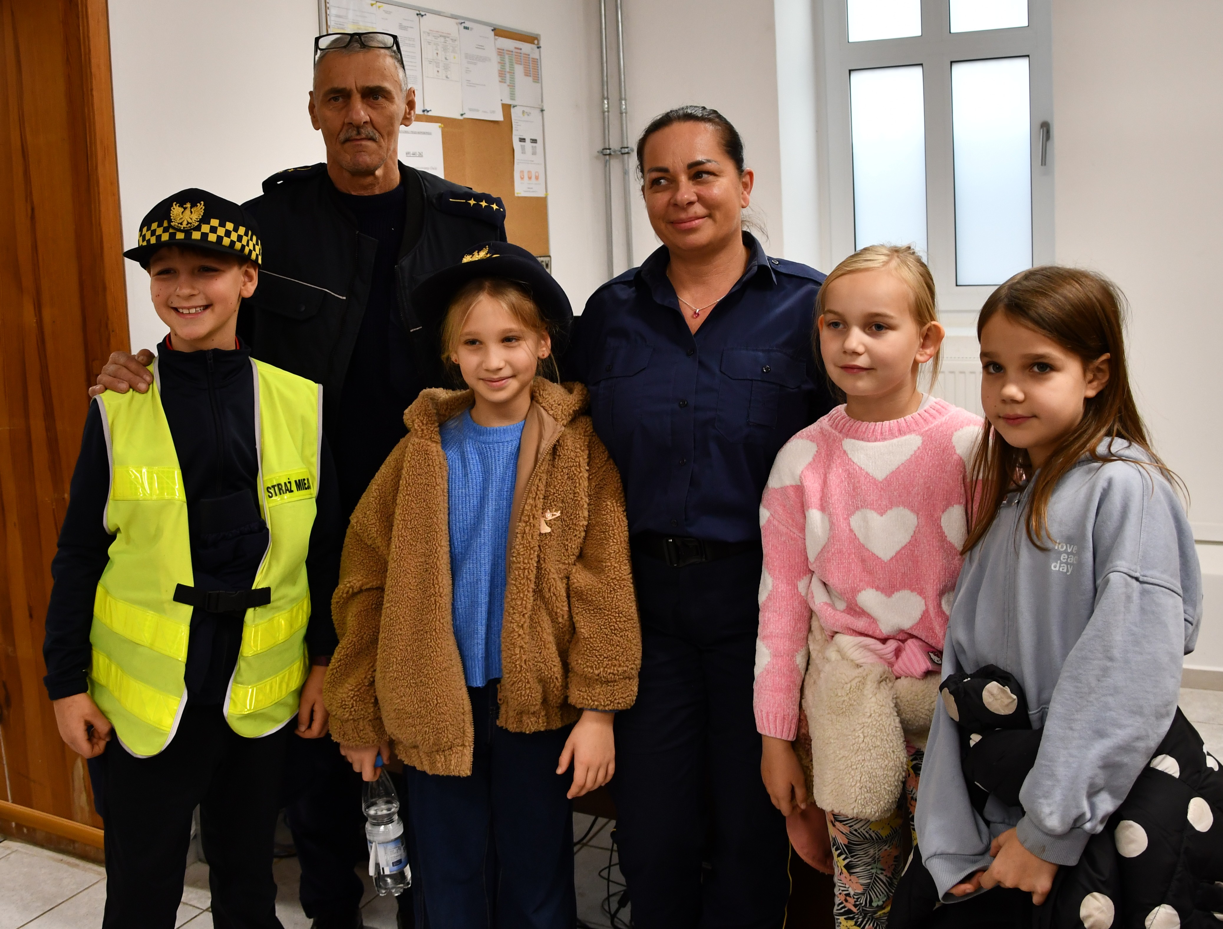Nie zabrakło także spotkania ze Strażą Miejską. Komendant Mirosław Karliński opowiedział o codziennych obowiązkach funkcjonariuszy, prezentując wyposażenie i elementy umundurowania. Każdy uczeń otrzymał na pamiątkę odblaskową opaskę bezpieczeństwa.