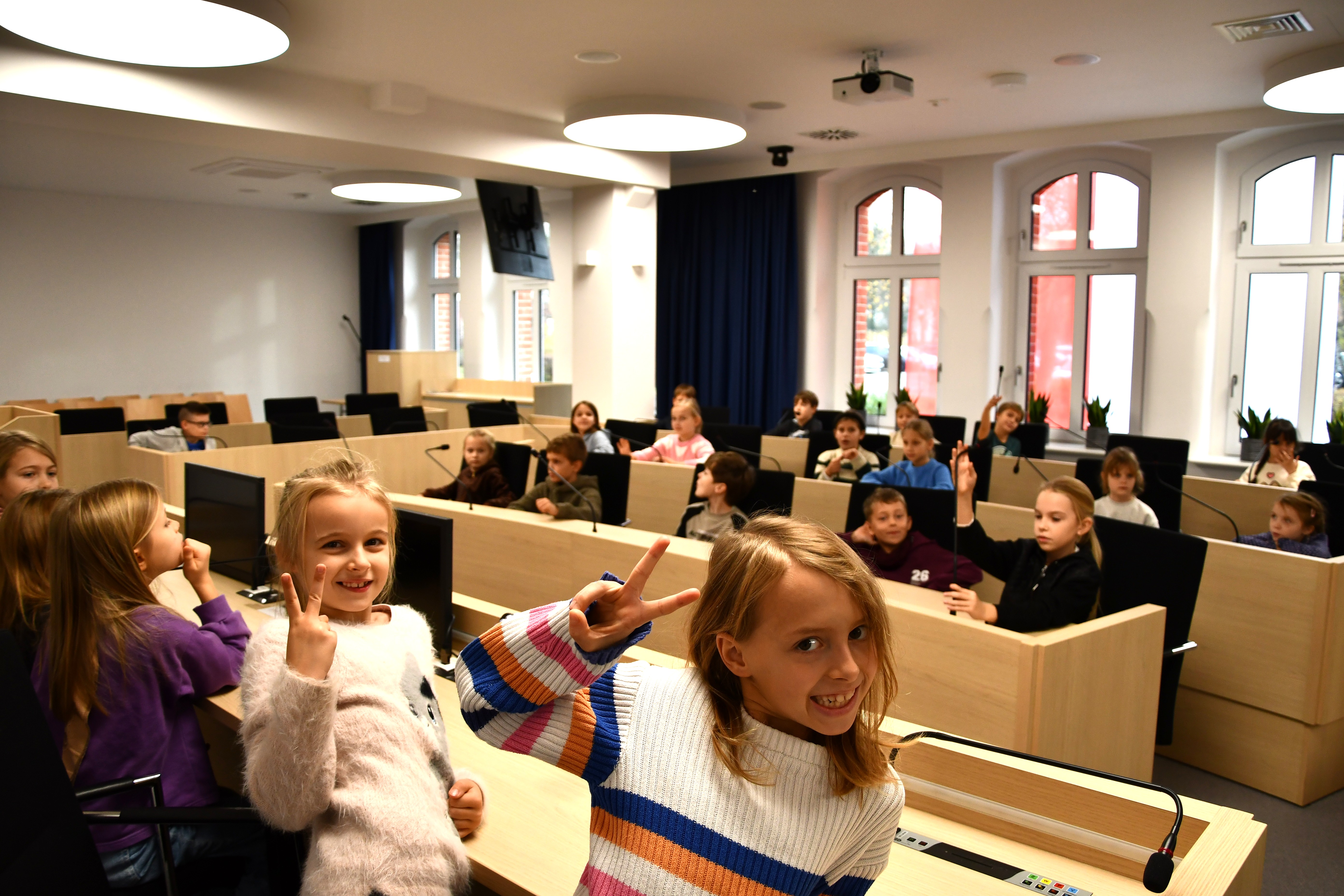 Wizyta rozpoczęła się od zwiedzenia sali obrad Rady Miasta. Uczniowie mogli zająć miejsca w ławach radnych, przyjrzeć się przyciskom do głosowania oraz mikrofonom, przez które prowadzone są dyskusje. Dzieci były ciekawe, jakie warunki trzeba spełnić, aby zostać radnym.