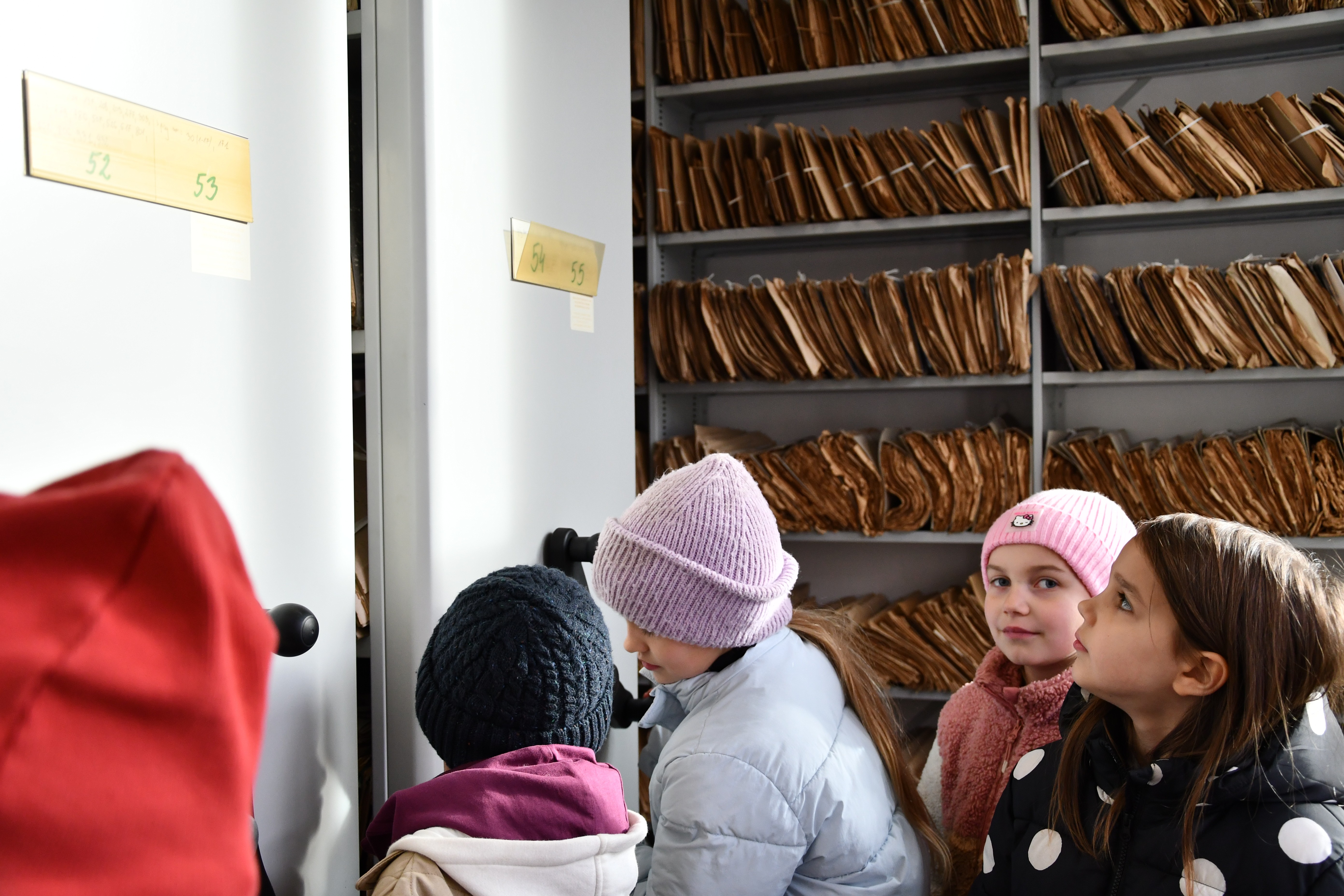 Na zakończenie młodzi odkrywcy odwiedzili Miejskie Archiwum. Widok tysięcy dokumentów zgromadzonych w setkach segregatorów zrobił na nich ogromne wrażenie. Największe emocje wywołały jednak regały sięgające sufitu, które można było łatwo przesuwać w różne strony za pomocą specjalnych korb.
