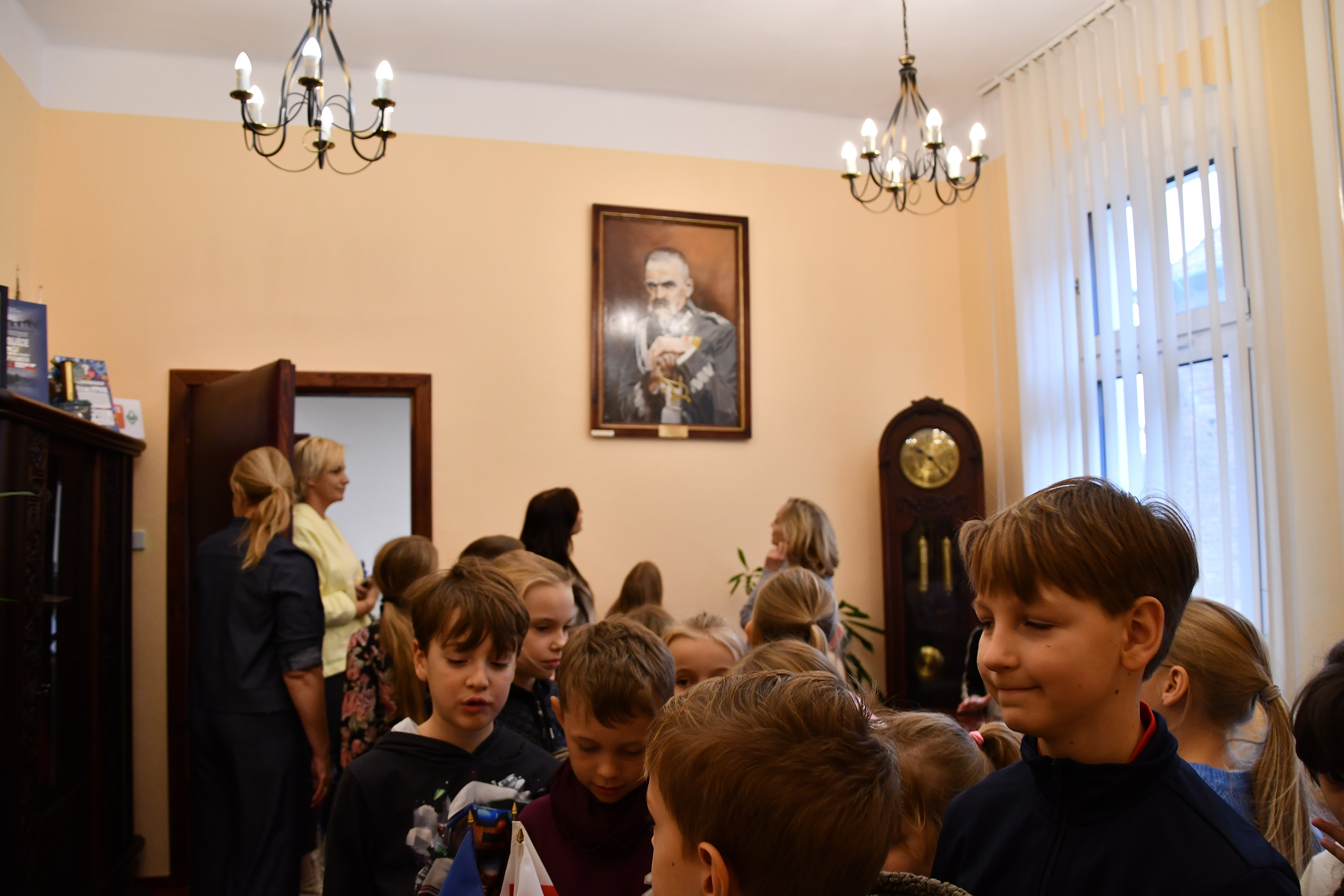 Uczniowie mieli także okazję zajrzeć do gabinetu Przewodniczącego Rady Miasta. Z zainteresowaniem obejrzeli łańcuch zakładany podczas uroczystych sesji oraz zabytkowy, stary zegar. Zwrócili także uwagę na portret Józefa Piłsudskiego wiszący na ścianie, co przyciągnęło ich uwagę w kontekście obchodów Święta Niepodległości poprzedniego dnia.