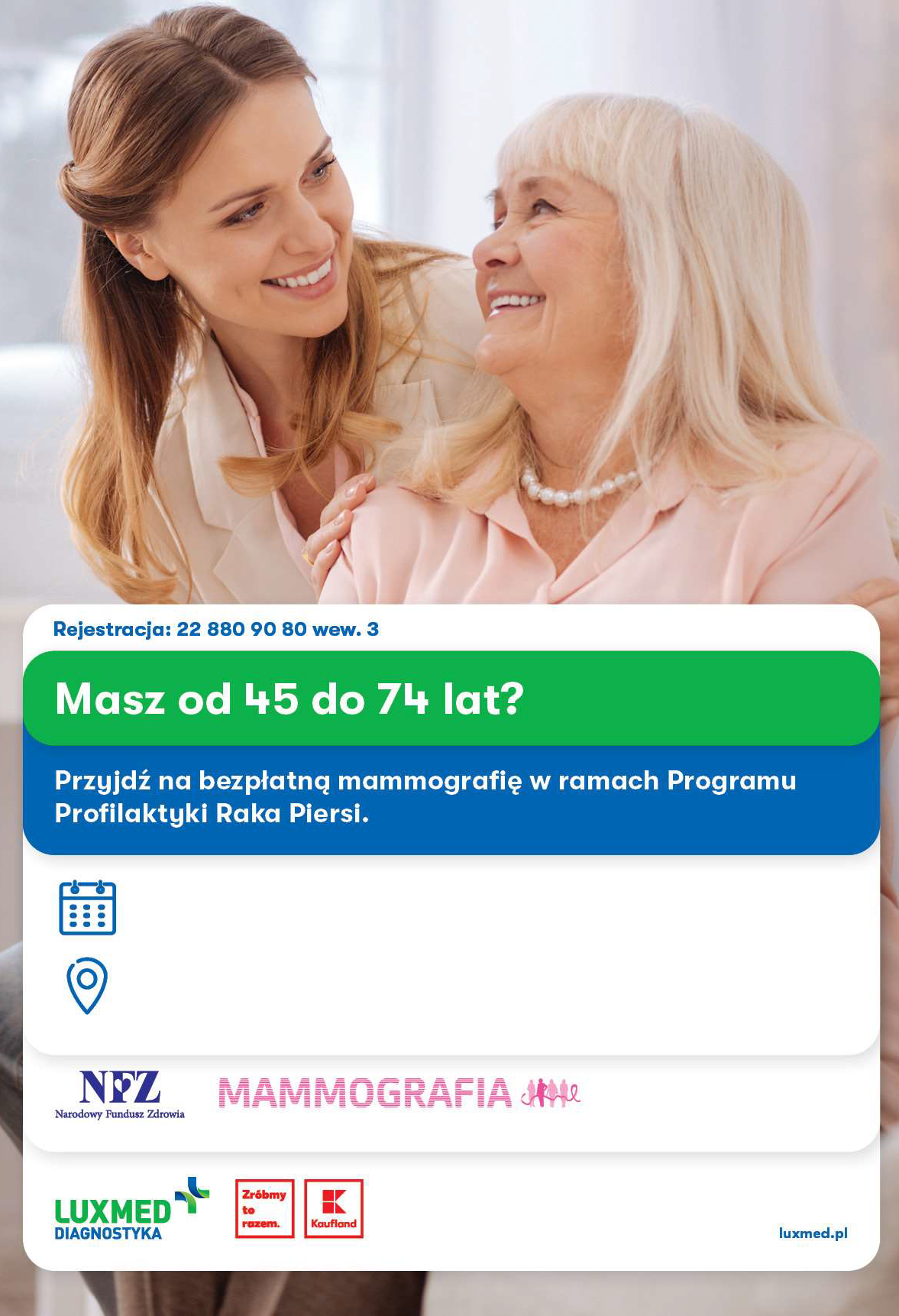 LUX MED Diagnostyka zaprasza na bezpłatne badania mammograficzne w technologii cyfrowej w ramach Programu Profilaktyki Raka Piersi finansowanego przez NFZ. W 2026 roku po raz pierwszy w badaniu będą mogły uczestniczyć Panie, które urodziły się w 1981 roku.
