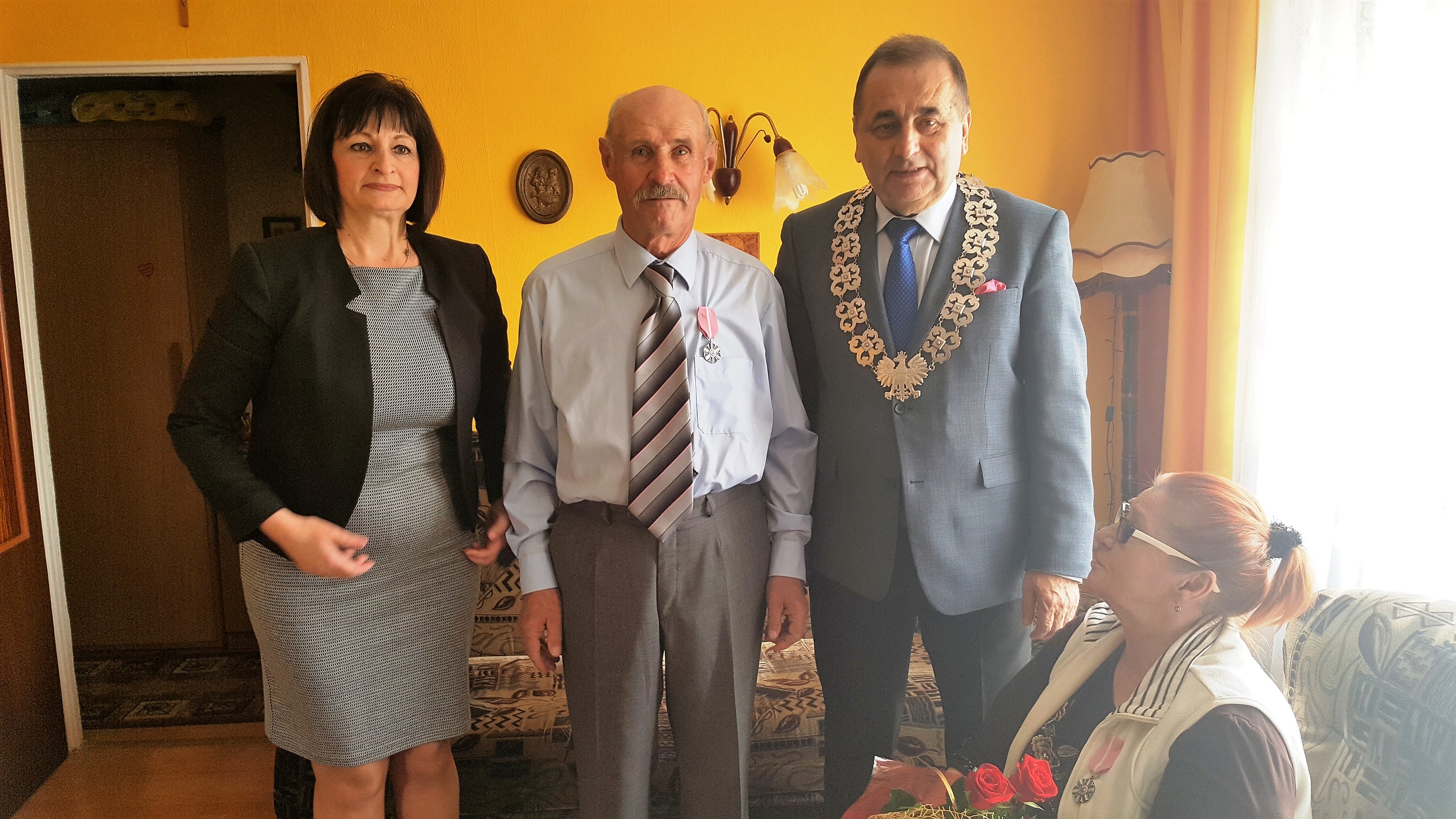 Na zdjęciu: ((od lewej) zastępca naczelnika USC Dorota Turlejska, Pan Czesław Kazimierski, prezydent Janusz Żmurkiewicz oraz Pani Elżbieta Kazimierska.