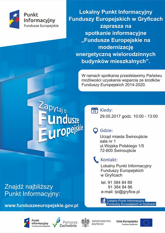 W dniu 29.05.2017 r. w sali nr 1 Urzędu Miasta w godzinach od 10-13 odbędzie się spotkanie informacyjne dotyczące pozyskiwania funduszy europejskich na modernizację energetyczną wielorodzinnych budynków mieszkaniowych. Spotkanie prowadzić będzie Lokalny Punkt Informacyjny Funduszy Europejskich przy Starostwie Powiatowym w Gryficach.