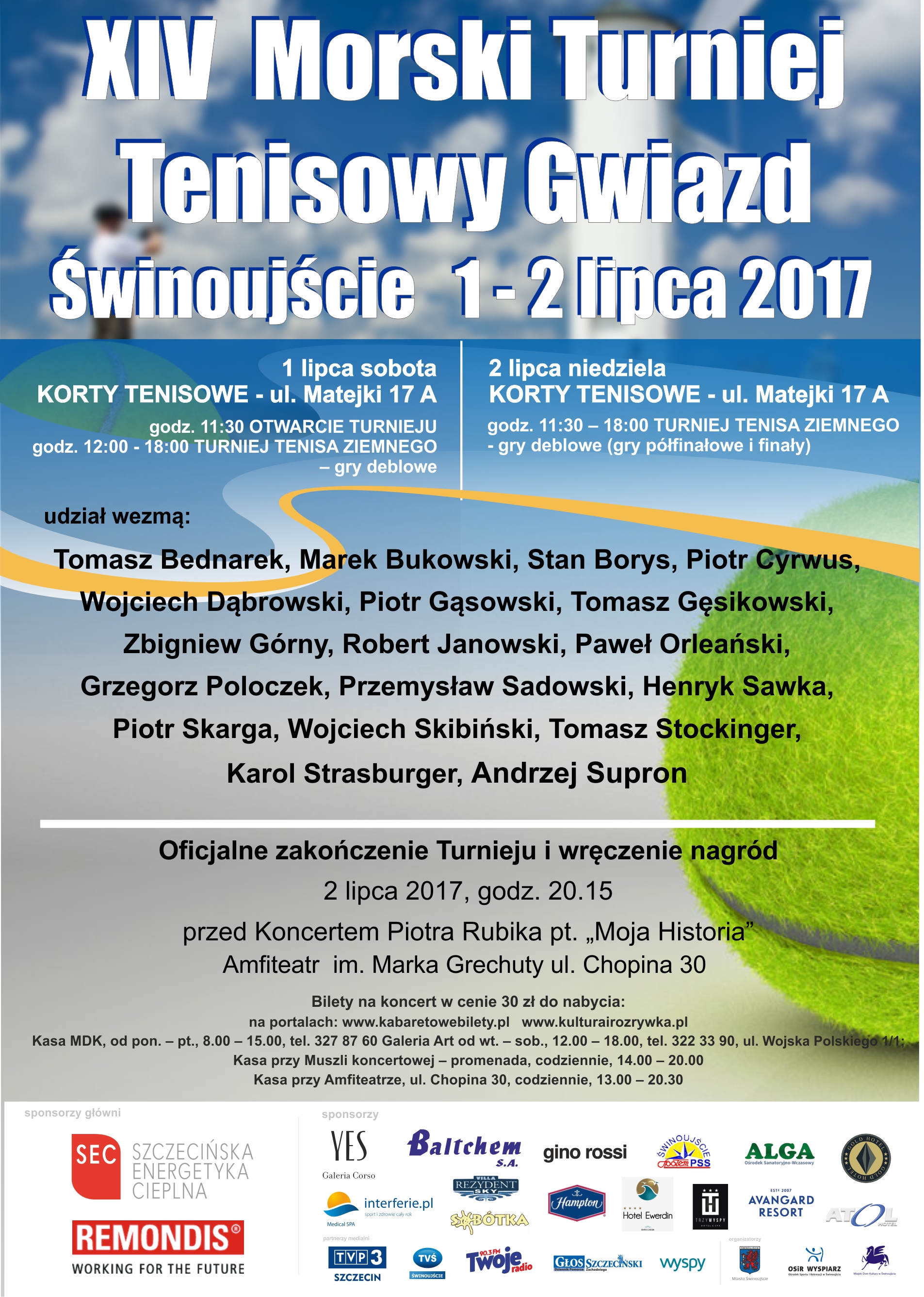 Robert Janowski, Piotr Gąsowski Grzegorz Poloczek, Tomasz Stockinger, Piotr Skarga, Zbigniew Górny, Tomasz Bednarek, Karol Strasburger, Tomasz Gęsikowski, Stan Borys, Henryk Sawka, Wojciech Dąbrowski, Andrzej Supron, Paweł Orleański, Wojciech Skibiński, Marek Bukowski wezmą udział w XIV Morskim Turnieju Tenisowym Gwiazd rozgrywanym na kortach przy ulicy Matejki 17. A w niedzielny wieczór zapraszamy do amfiteatru na wielki koncert Piotra Rubika zatytułowany „Moja historia”. Na turniej tenisowy wstęp za darmo. Na koncert bilety po 30 złotych.