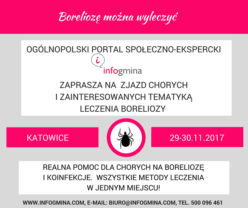 Ogólnopolski portal społeczno-ekspercki Infogmina.com serdecznie zaprasza do udziału w Ogólnopolskim zjeździe pod hasłem „Boreliozę można wyleczyć”. Zjazd, dedykowany chorym i zainteresowanym tematyką leczenia boreliozy, odbędzie się w Katowicach 29 i 30 listopada 2017 roku.