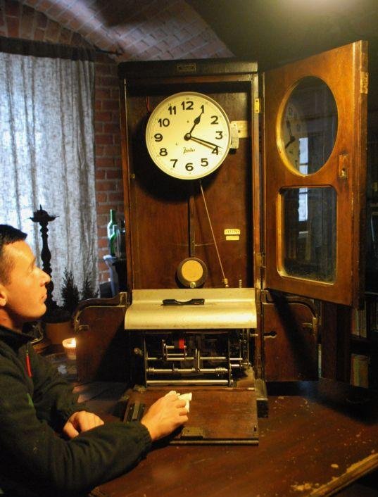 Zegar przemysłowy z mechanizmem. Mały orzełek Reichswery wybity na obudowie świadczy, że zegar służył w organizacji- zakładzie związanym z armią.