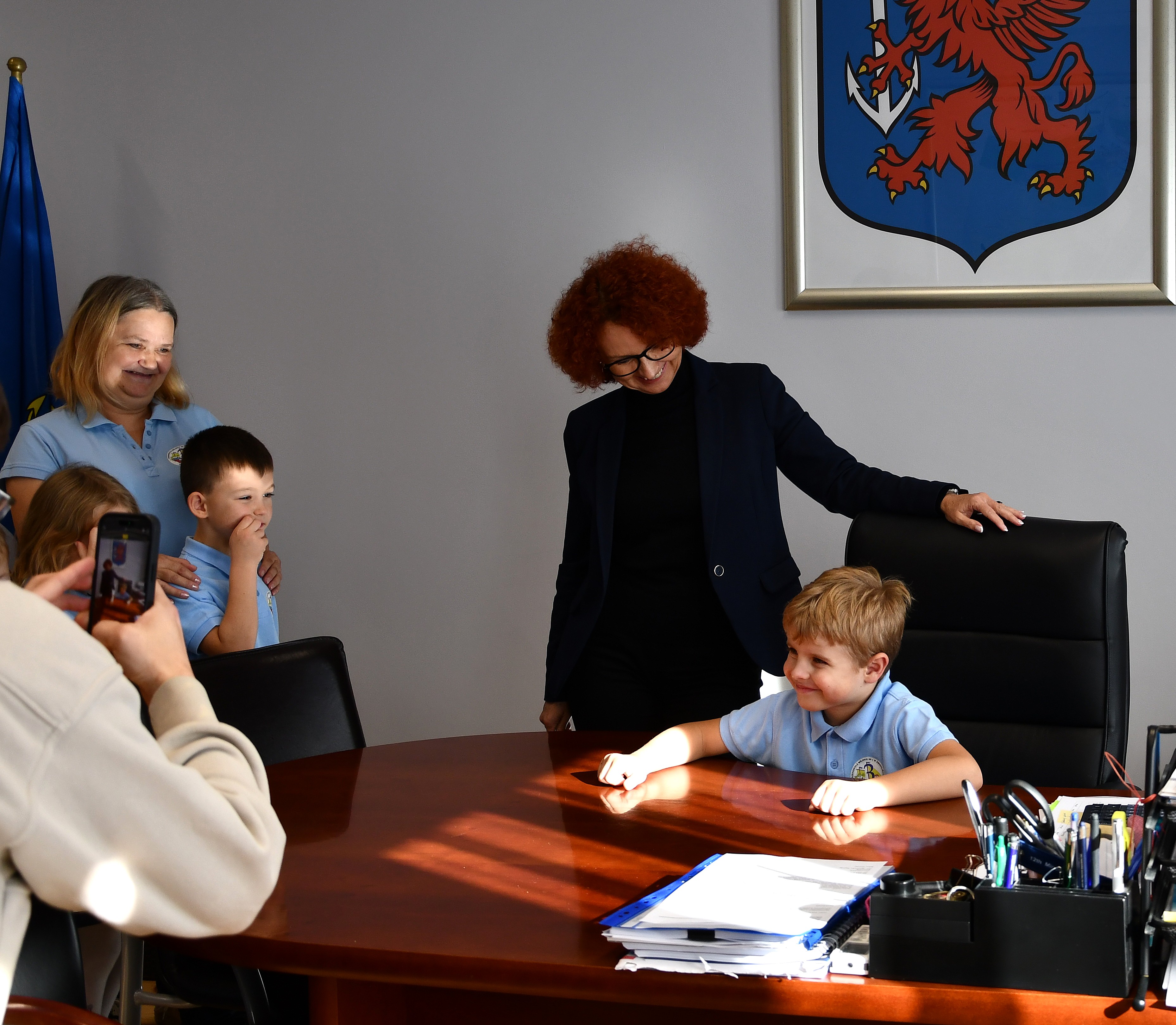 Przedszkolaki rozpoczęły swoją wizytę od spotkania z Panią Prezydent Joanną Agatowską. Z zainteresowaniem słuchały opowieści o pracy prezydenta miasta, zadawały mnóstwo pytań związanych z zarządzaniem Świnoujściem, a nawet miały wyjątkową okazję usiąść w prezydenckim fotelu.