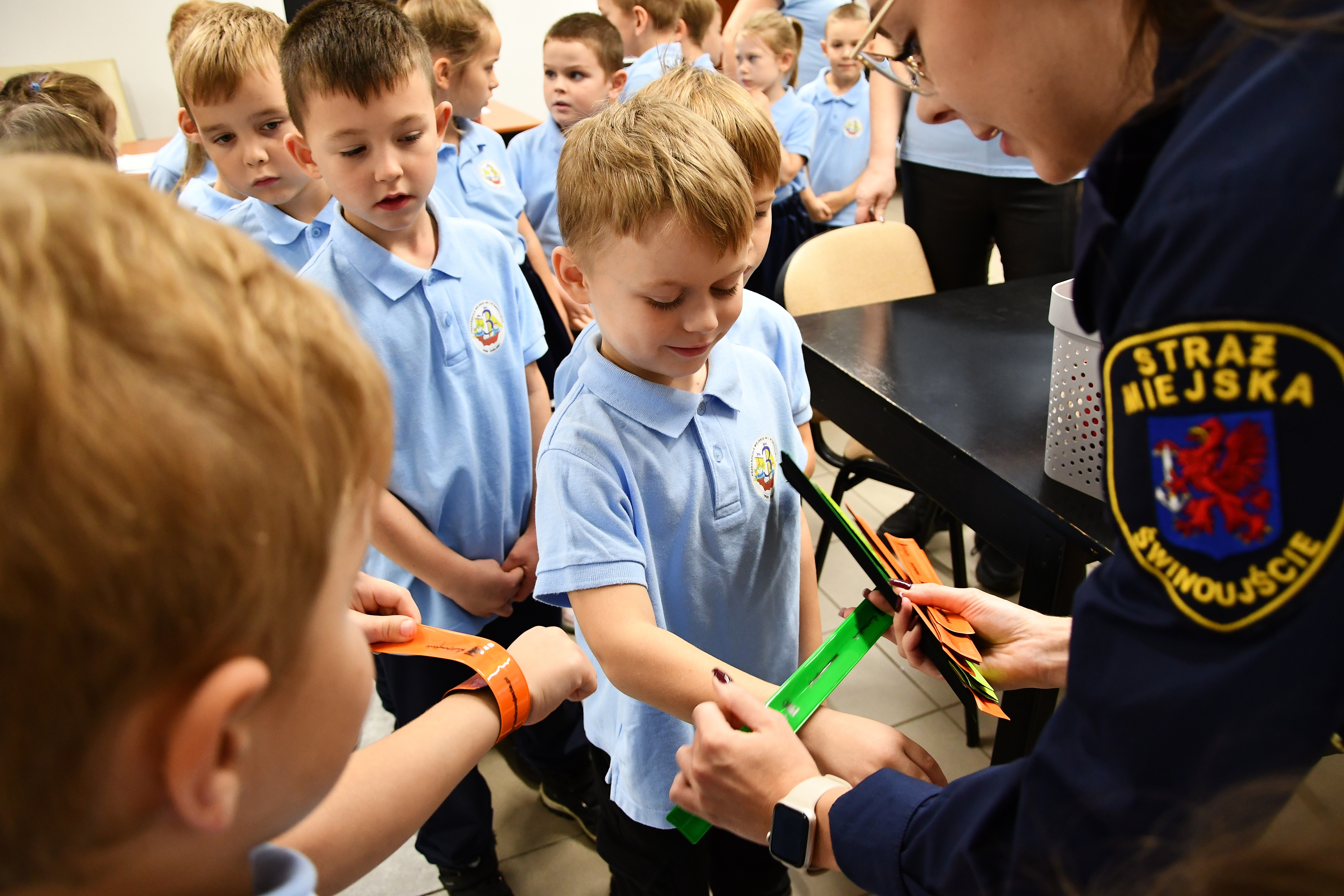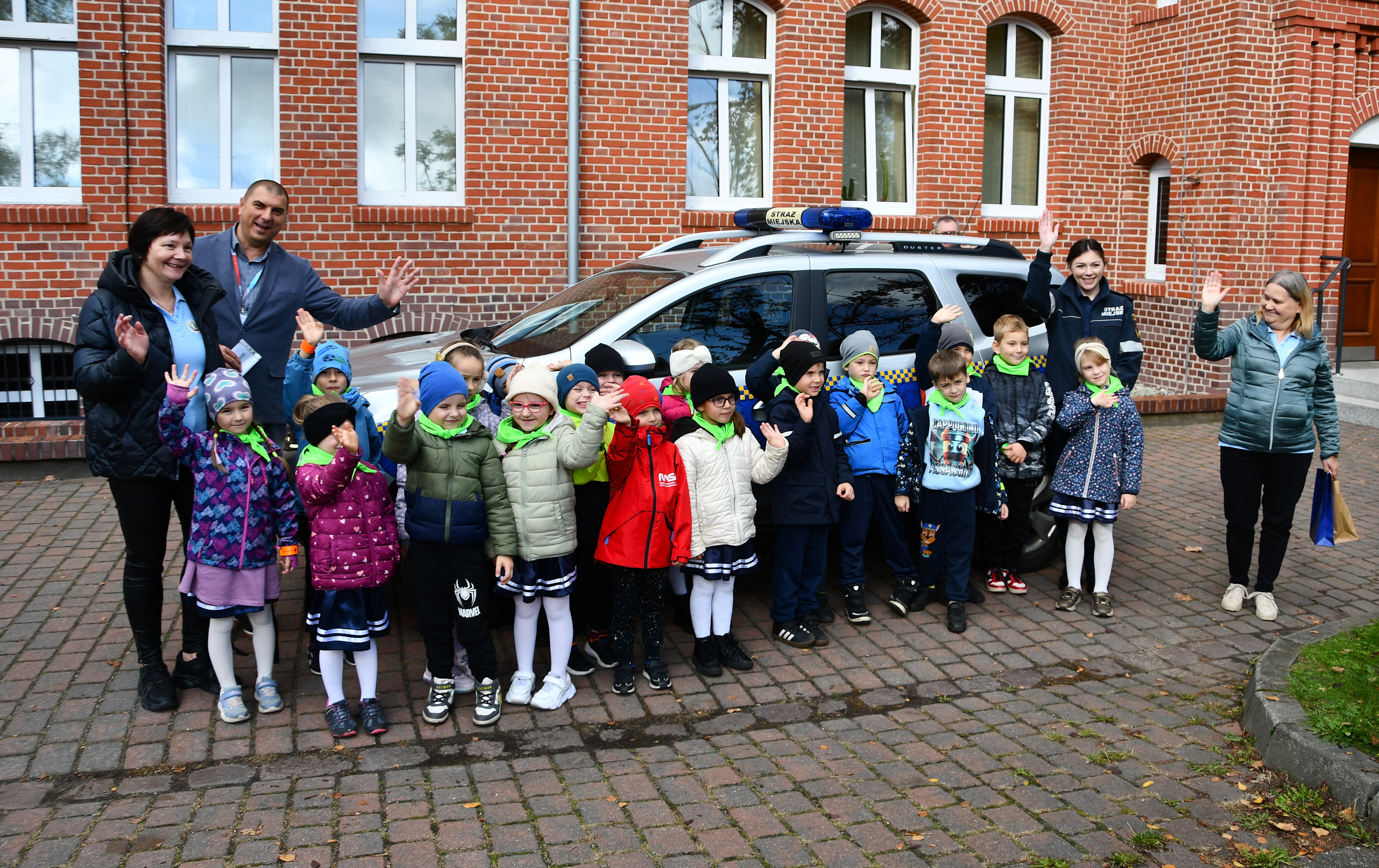 W dalszej części wycieczki dzieci odwiedziły siedzibę Straży Miejskiej. Komendant Mirosław Karliński opowiedział o codziennych obowiązkach funkcjonariuszy, a dzieci mogły z bliska obejrzeć elementy umundurowania i wyposażenia. Dużym przeżyciem była możliwość wejścia do radiowozu i zajęcia miejsca za jego kierownicą. Na pamiątkę spotkania każdy uczestnik otrzymał odblaskową opaskę.
