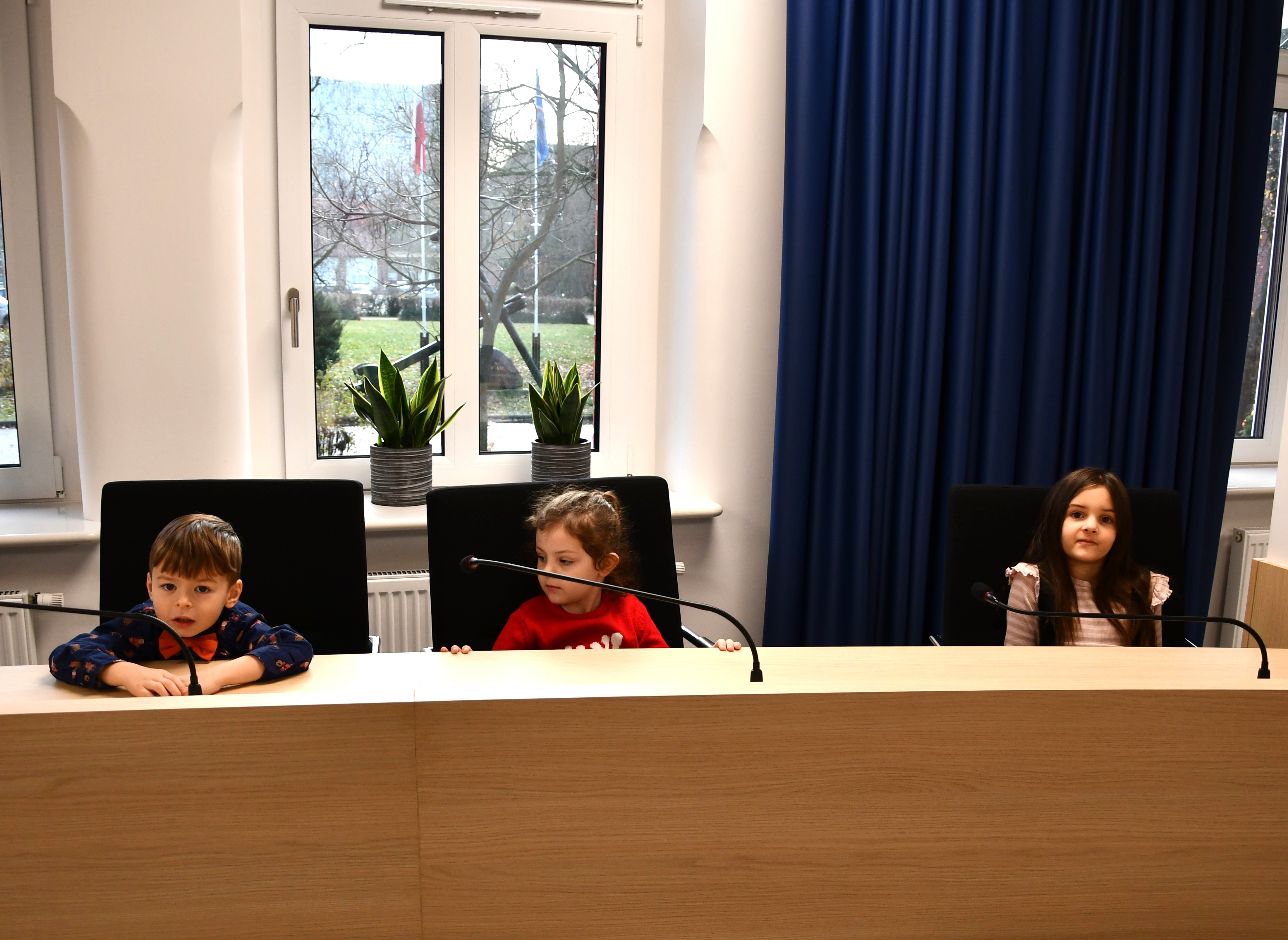 Po dekorowaniu choinki maluchy wyruszyły na małą wycieczkę po urzędzie miasta. Pierwszym punktem była sala sesyjna Rady Miasta. Dzieci z ciekawością oglądały stanowiska radnych, kolorowe przyciski do głosowania oraz mikrofony, przez które prowadzi się dyskusje.