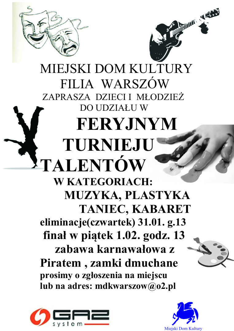 Miejski Dom Kultury filia Warszów zaprasza dzieci i młodzież do udziału w Feryjnym Turnieju Talentów w kategoriach: muzyka, taniec, plastyka i kabaret. Na eliminacje zapraszamy w czwartek 31. stycznia od godz.13.00 po uprzednim zgłoszeniu w MDK na Warszowie lub na adres: mdkwarszow@o2.pl